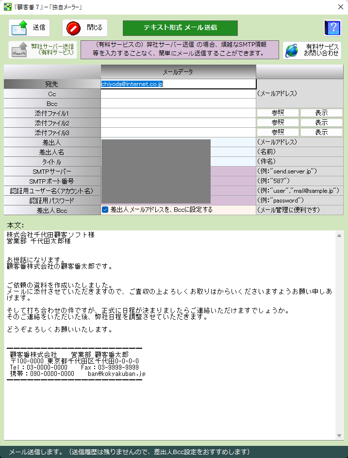 顧客名差し込み対応の『顧客番』メール送信機能ですが、個別のメール送信は「独自メーラー」機能、メルマガ配信などにも利用可能なグループ一括のメール送信は「一発メール」機能で、顧客アプローチに多いに役立つ機能となります。
